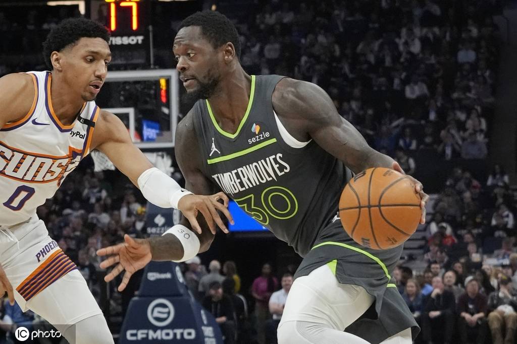 森林狼队首发:朱利叶斯-兰德尔、安东尼-爱德华兹、鲁迪-戈贝尔、贾登-麦克丹尼尔斯、迈克-康利