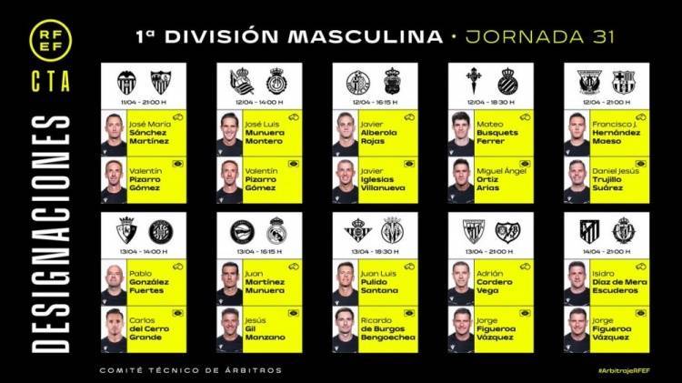 直播吧4月10日讯 西甲官方公布了第31轮比赛的裁判安排,马埃索执法莱加内斯vs巴萨,穆努埃拉执法阿拉维斯vs皇马。