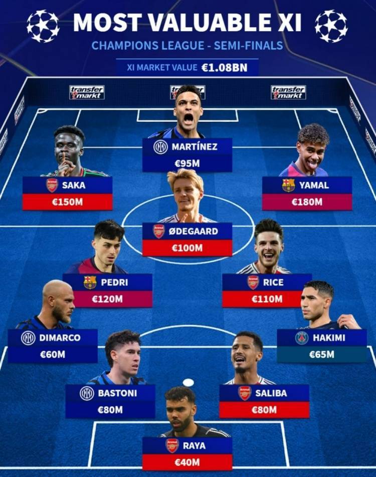 直播吧5月1日讯 本赛季欧冠半决赛激战正酣,德转也盘点了4支球队最贵阵容,其中阿森纳5人在列,具体如下: